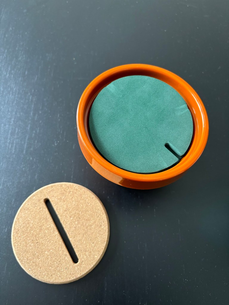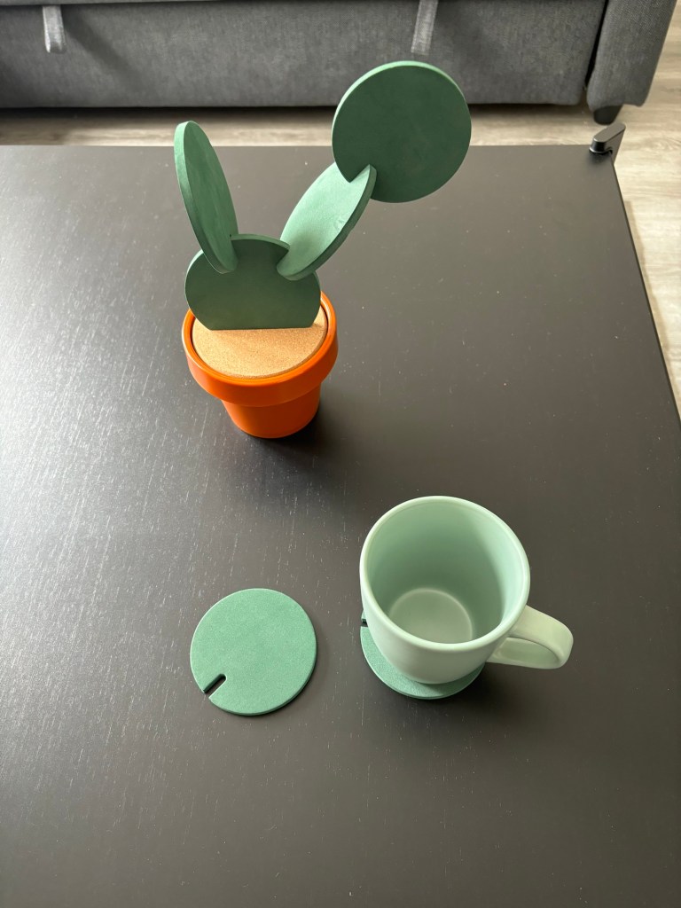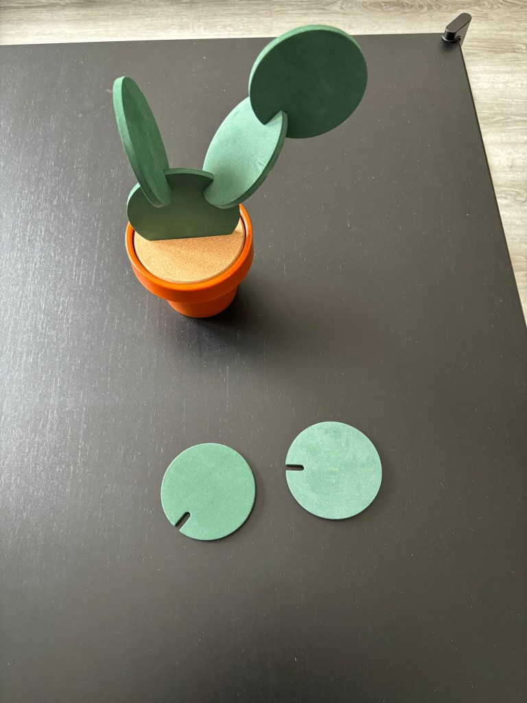 The corkboard disc is there to give the illusions of soil and has a hole which a coaster can be slotted into to allow the consumer to build their fake cactus how they like.