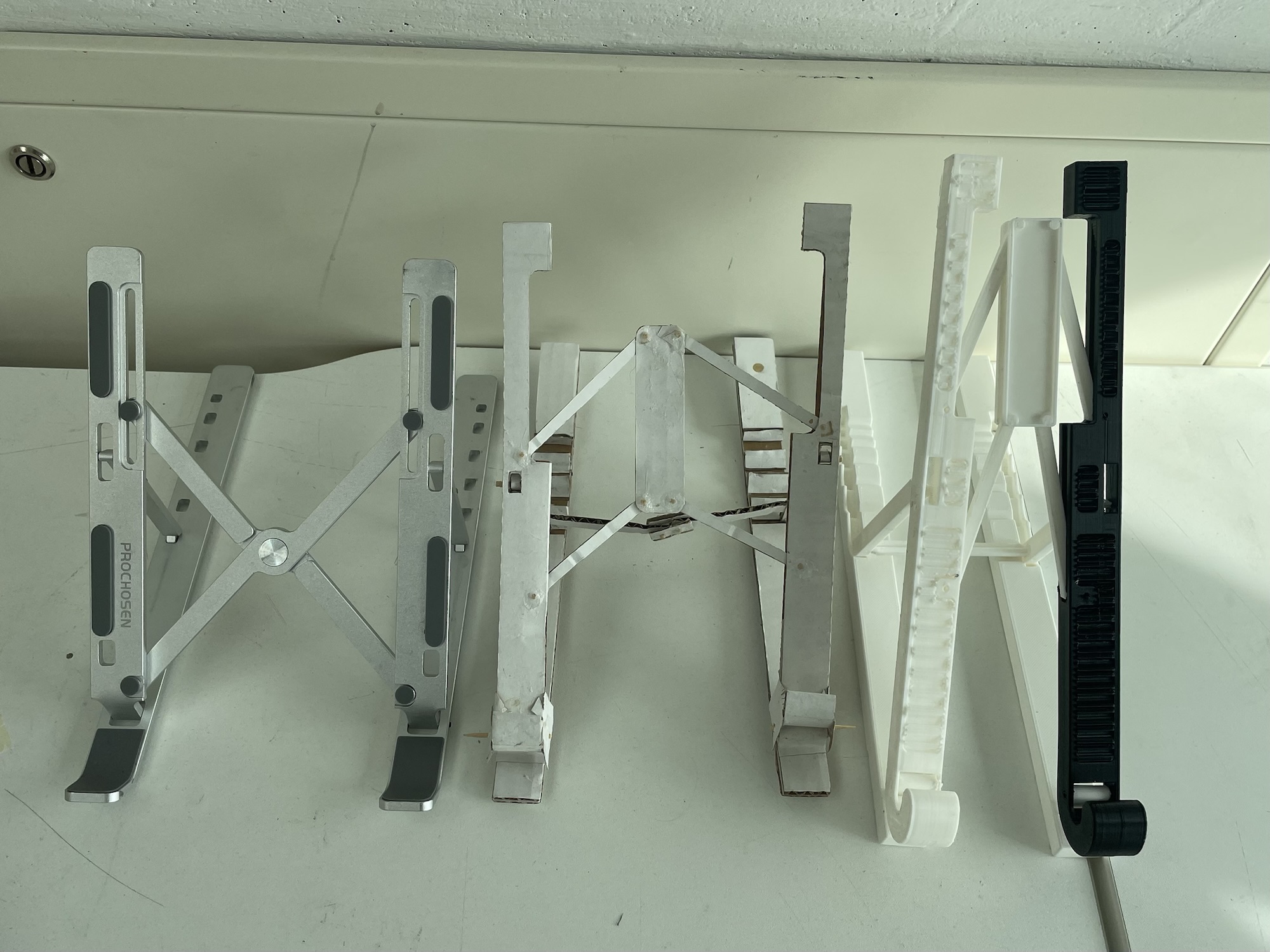 After initial consultation with the user, design ideas were sketched and user input was given on each design. From there, cardboard modeling was undertaken to explore the possible mechanisms and work out the logistics of them before a full cardboard prototype was made and further user feedback was taken. The next step was to mock up the design on CAD further adjusting the design to better fit the user’s needs. By the end of the project, the design was heavier but still lightweight, capable of supporting the same weight and with more angles than the original. Further user testing explored the most suitable angles. The legs of the stand were connected to ensure they moved in concert. And guides were placed on the side to allow them to be moved blind. The stand legs were adjusted so they no longer had to bear the weight of the stand and the laptop when adjusting the angle and could also be moved by sliding. The time limit on the project meant that I was unable to address the feet obstructing the keyboard but otherwise all design targets were met.